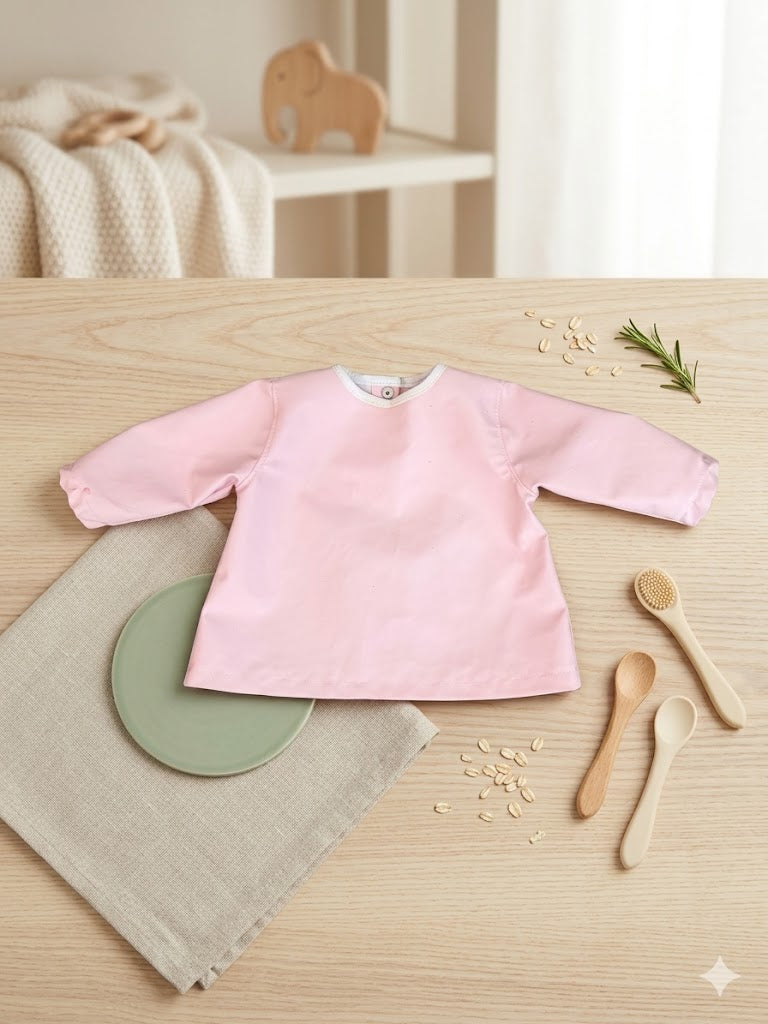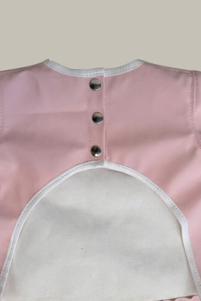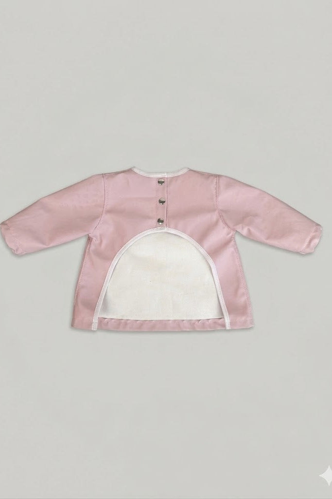 È facile da indossare grazie alla pratica chiusura sul retro con tre bottoncini, pensata per garantire una vestibilità sicura e confortevole. I polsini con elastichino aiutano a proteggere anche le manine, evitando che cibo e liquidi passino all’interno.