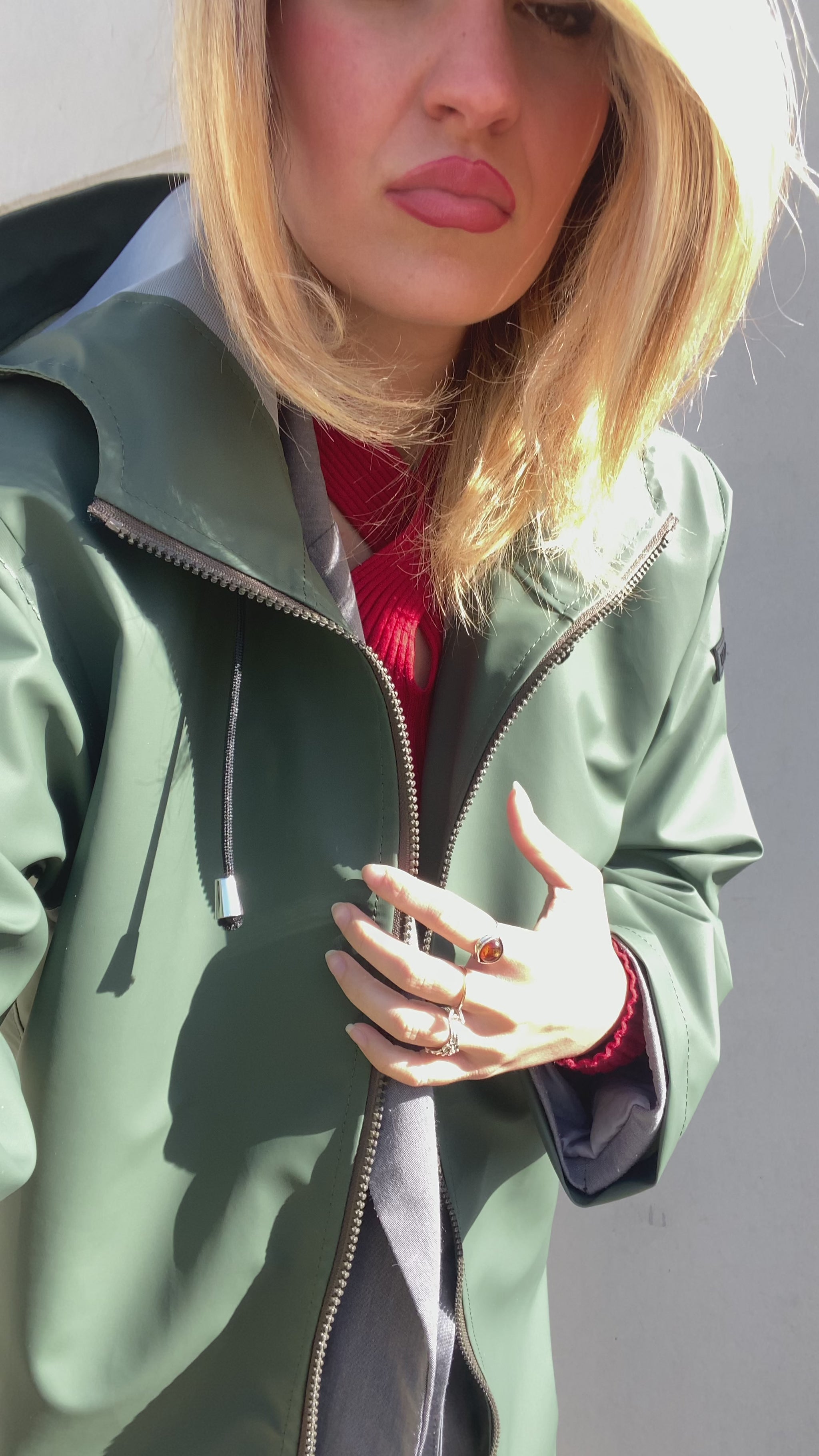 Una giacca impermeabile adatta a tutto il periodo della gravidanza e a quello successivo, grazie alle cerniere strategiche che permettono di regolarne l’ampiezza.