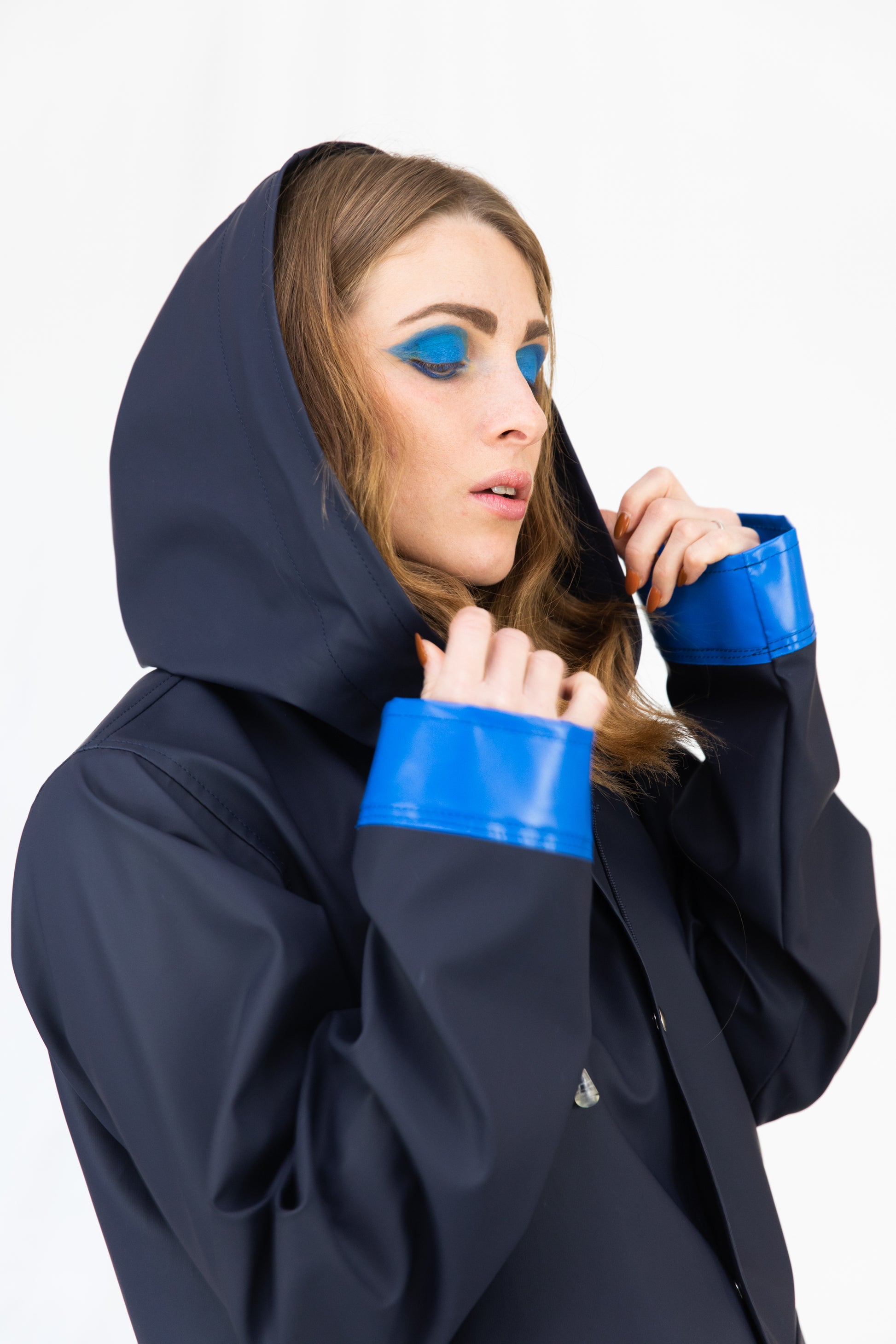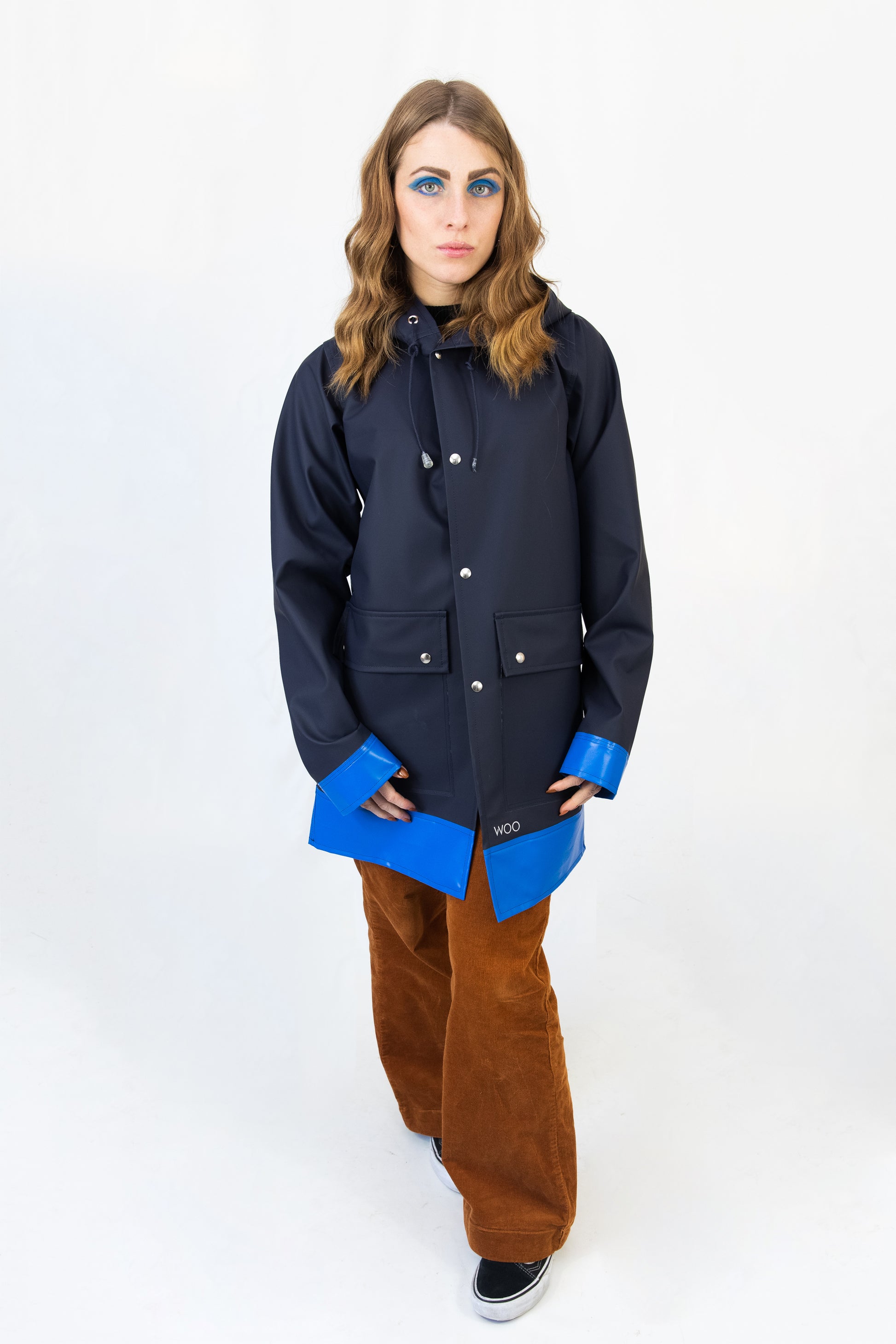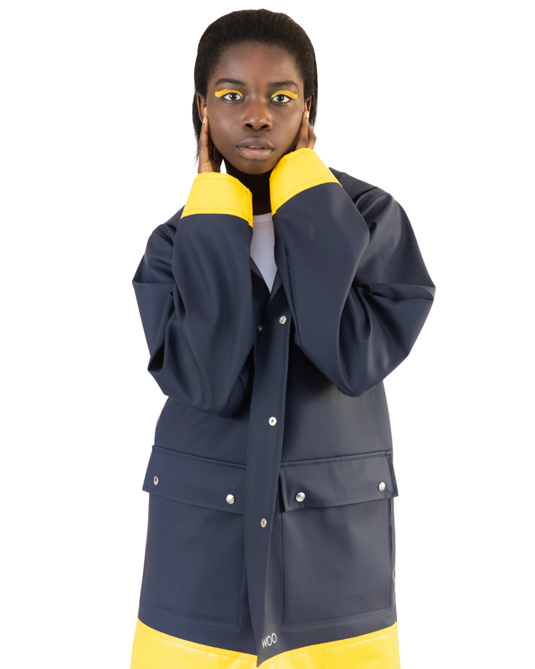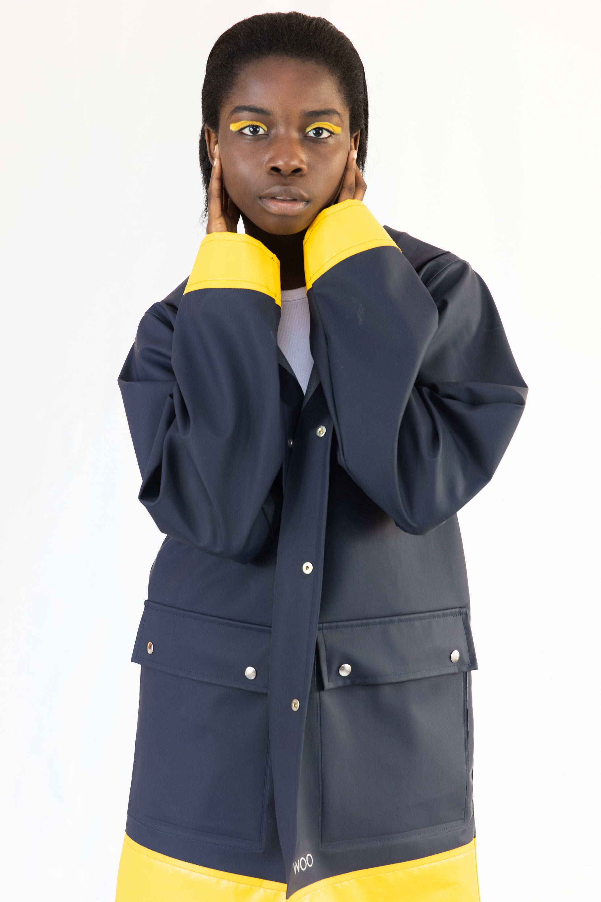 Il Striped Raincoat di Woo Raincoats unisce design e sostenibilità in un capo impermeabile unico. Realizzato a mano a Mesagne, in Puglia, con materiali riciclati, questo impermeabile a righe offre protezione contro la pioggia e uno stile distintivo.
